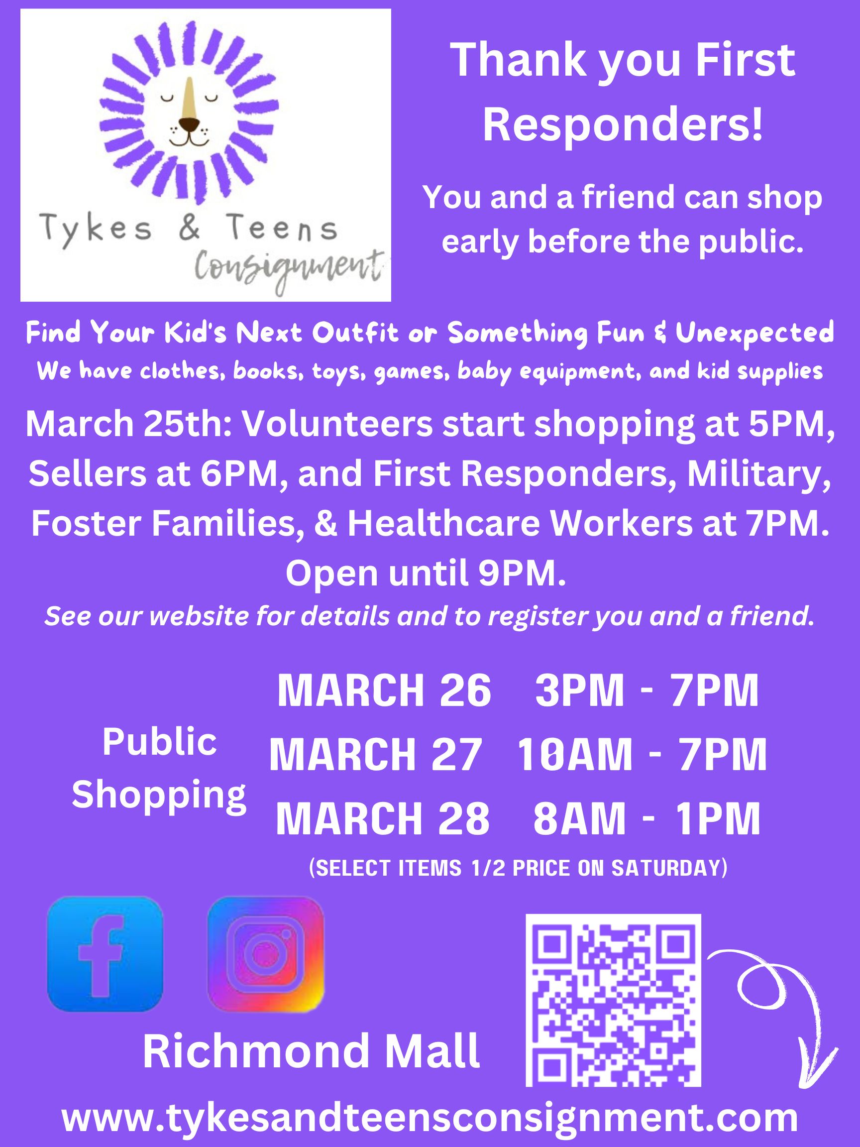 First responders (and/or a member of their family) can shop early on Wednesday March 25th starting at 7:00pm to 9:00pm. Anyone in their first responder uniform will be admitted without a pass. If a first responder wishes to register someone for a pass, please use the link below.